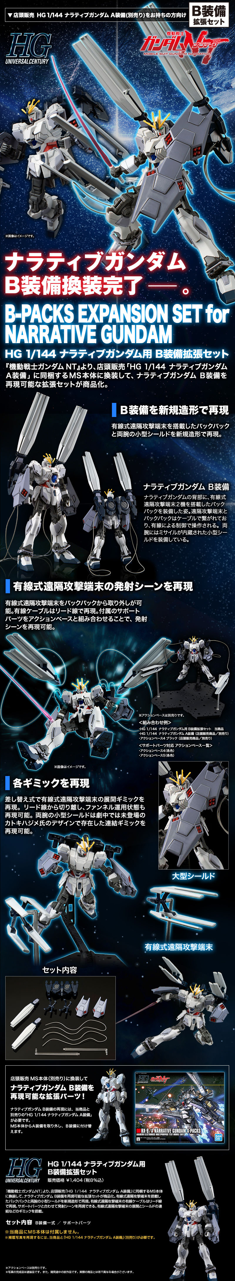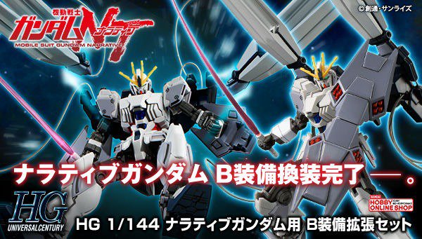 『機動戦士ガンダムNT』より、店頭販売アイテム「HG 1/144 ナラティブガンダム A装備」に同梱するMS本体に換装して、ナラティブガンダム B装備を再現可能な拡張セットが商品化。