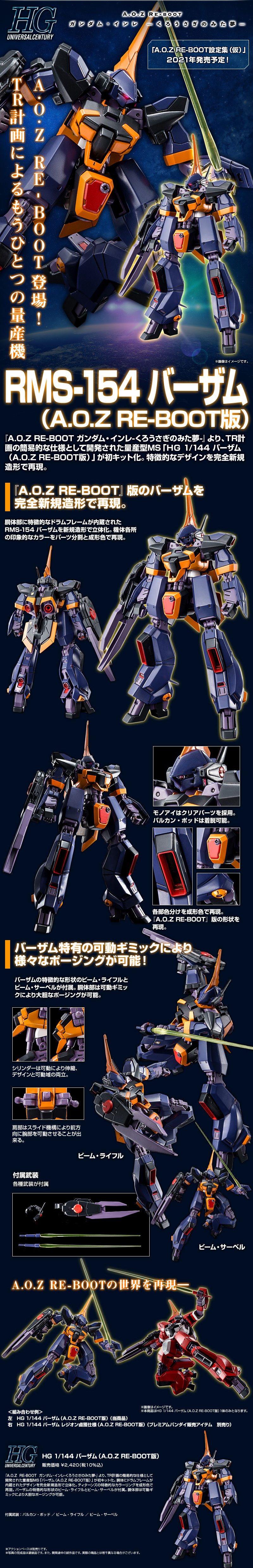 『A.O.Z RE-BOOT ガンダム・インレ-くろうさぎのみた夢-』より、TR計画の簡易的な仕様として開発された量産型MS「バーザム(A.O.Z RE-BOOT版)」が初キット化。