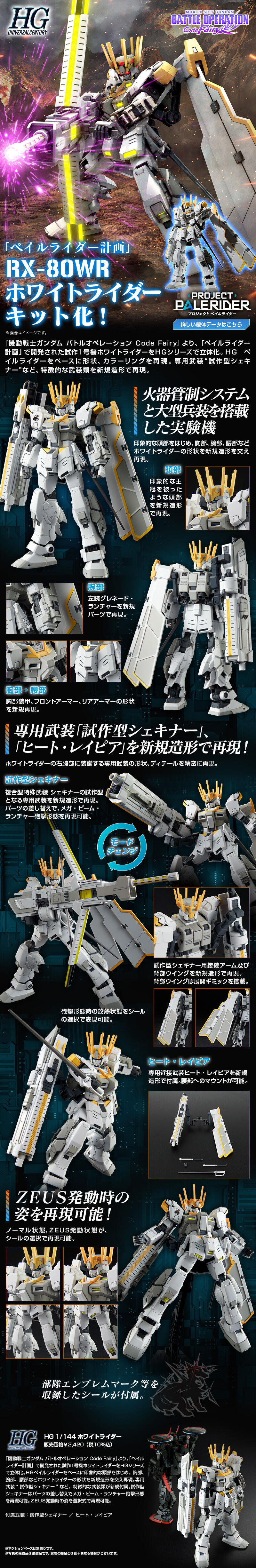 『機動戦士ガンダム バトルオペレーション Code Fairy』より、「ペイルライダー計画」で開発された試作1号機ホワイトライダーをHGシリーズで立体化。